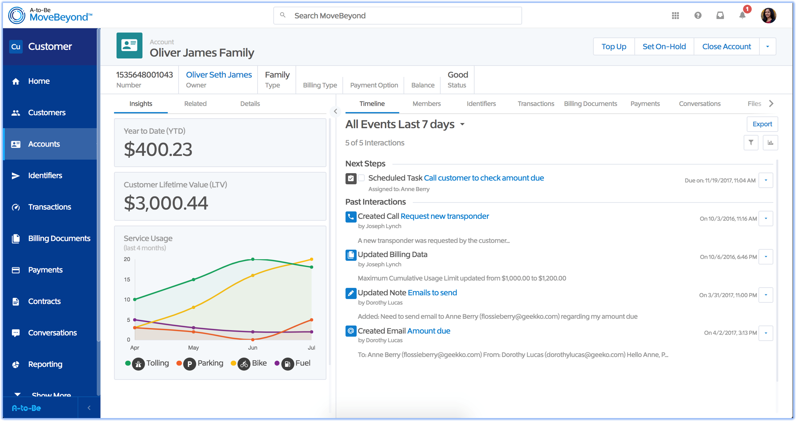 A-to-Be MoveBeyond integrates tolling operations through a single back office system for a seamless user experience. The operational component links the roadside and back office to ensure reliability. The commercial component analyzes, processes and dispatches all customer and transaction information through a user-friendly account management portal.